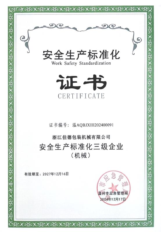 我们理解品质控制价格,质量决定企业的生存,佳德质量体系的完善,各项质量活动已事先制度化、程序化,规范化。并率先通过ISO90001国际质量体系认证和权威CE安全认证。